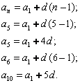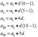 Составим формулы для пятого и десятого члена, используя формулу вычисления n-ого члена арифметической прогрессии: