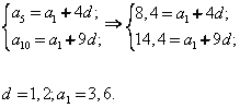 Пример 5: Пятый член арифметической прогрессии равен 8,4, а ее десятый член равен 14,4. Найти двадцать второй член этой прогрессии.